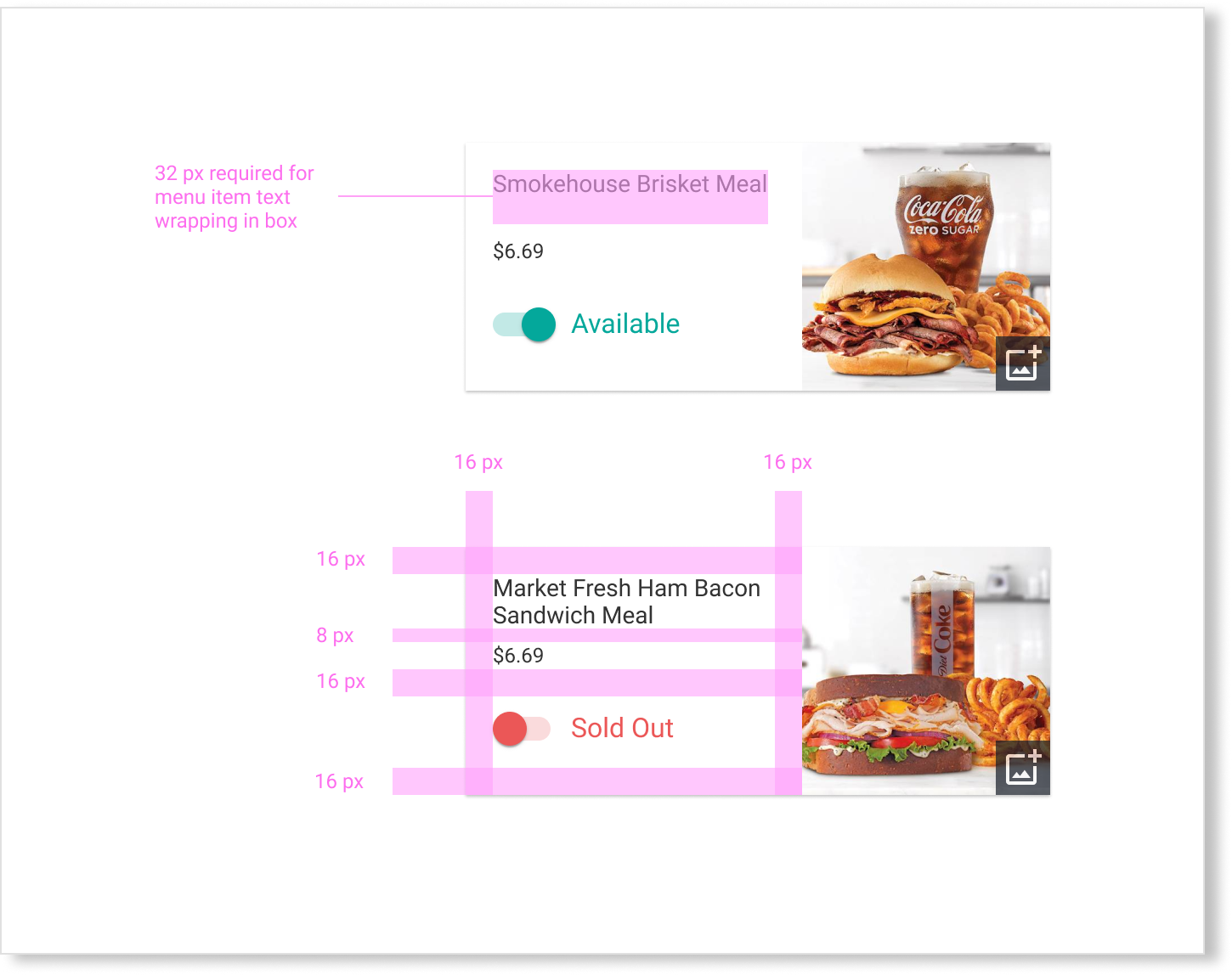 For displaying the restaurant menu, I decided to go with the menu items showing as cards in a grid layout. The item card shows some basic information such as the name of the item, price, and the image. Because marking an item sold out will be the most used feature on Menu Management UI, I decided to add the toggle button on the item card so restaurant operators can see the menu and easily switch an item from “available” to “sold out”.
