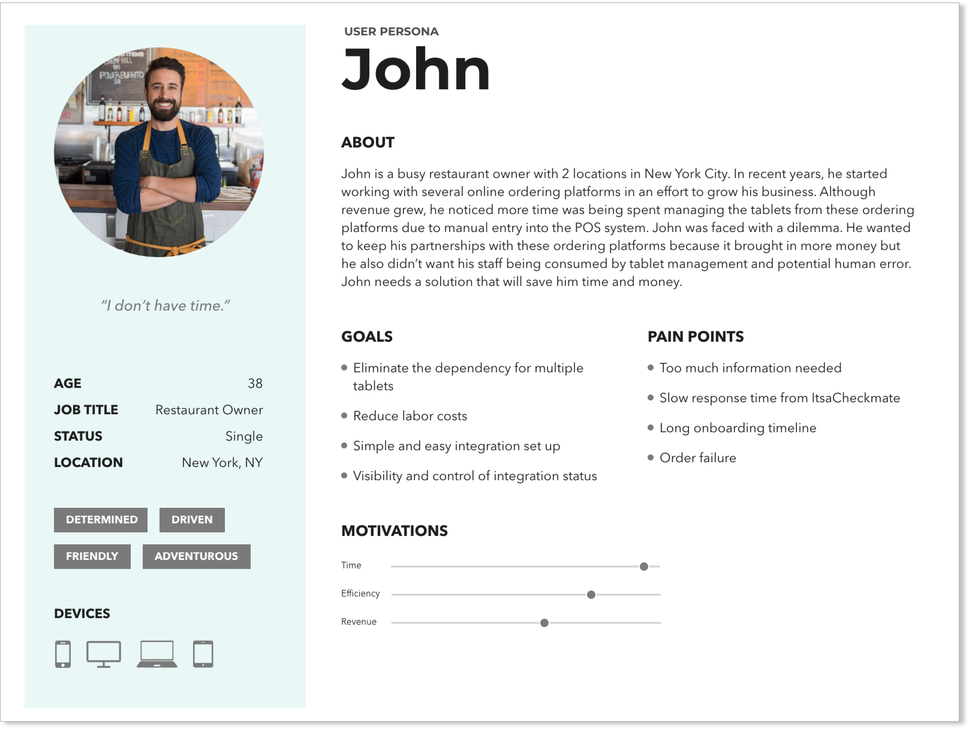 Before designing the UI, first I had to understand who were the users and what are their needs. I had the opportunity to collaborate with some Small-Medium Business (SMB) customers, aka "mom and pop". I was able to get direct feedback about their needs and pain points in managing menus on different ordering platforms. From their feedback, I was able to construct user persona that was very important to me when I start on any design project related to the Menu Management UI.