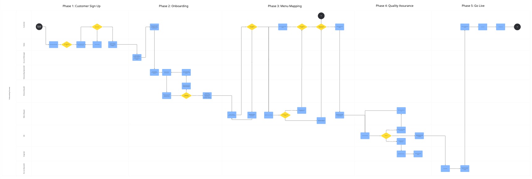 At the time, there was no comprehensive view of the onboarding workflow. Each team operated with a limited understanding—focused only on their specific responsibilities and immediate handoffs. This lack of visibility created a siloed organization, where miscommunication and inefficiencies became inevitable.