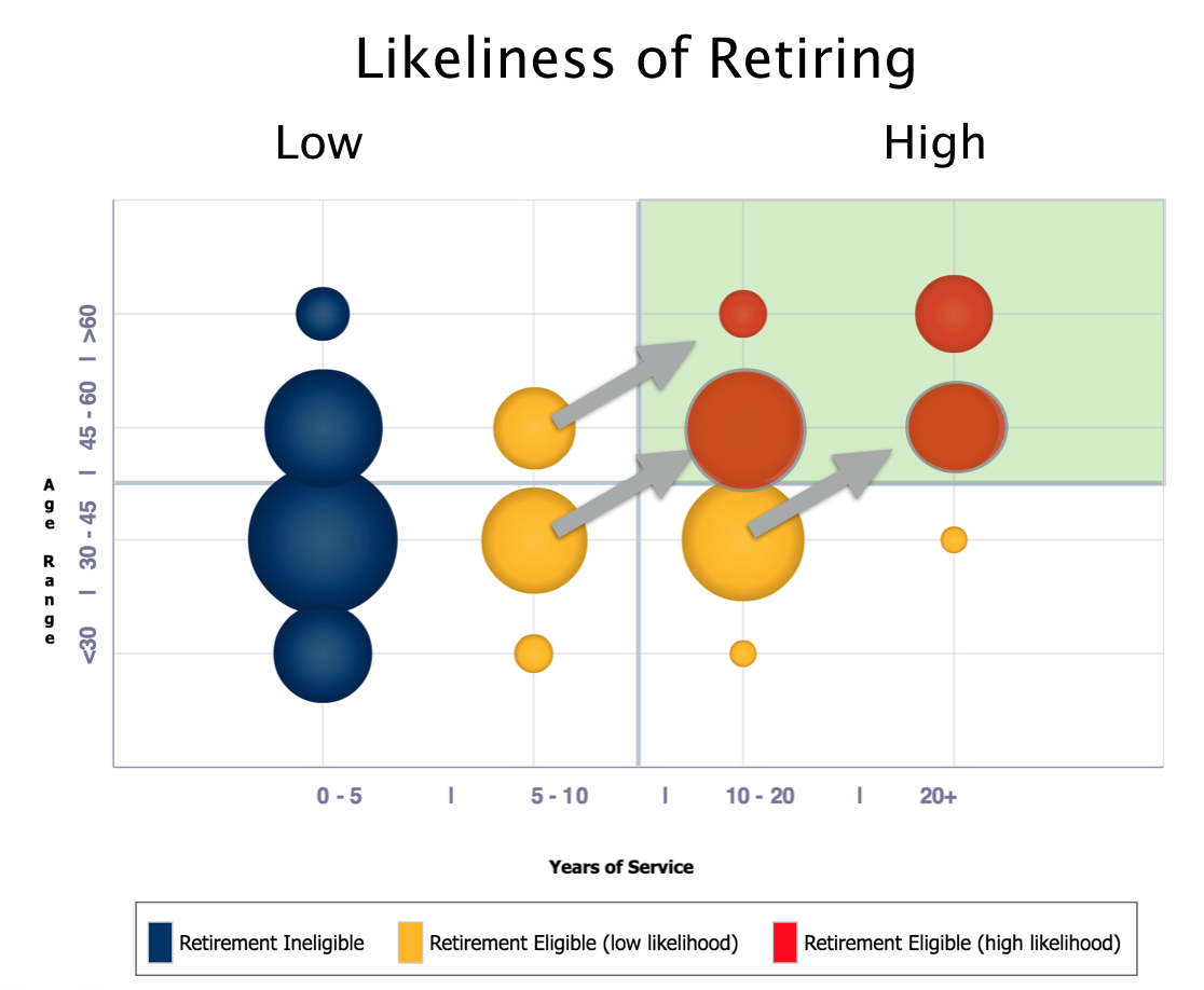 What’s even more alarming is 50% of CSS Research Administrators are eligible to retire. Although they may not retire immediately, the likeiness of CSS Research Administrators retiring increases as time progresses (as indicated in the gray arrow).